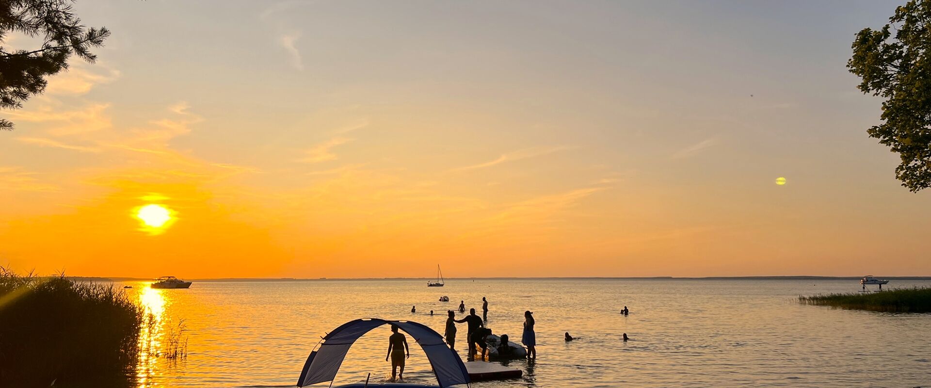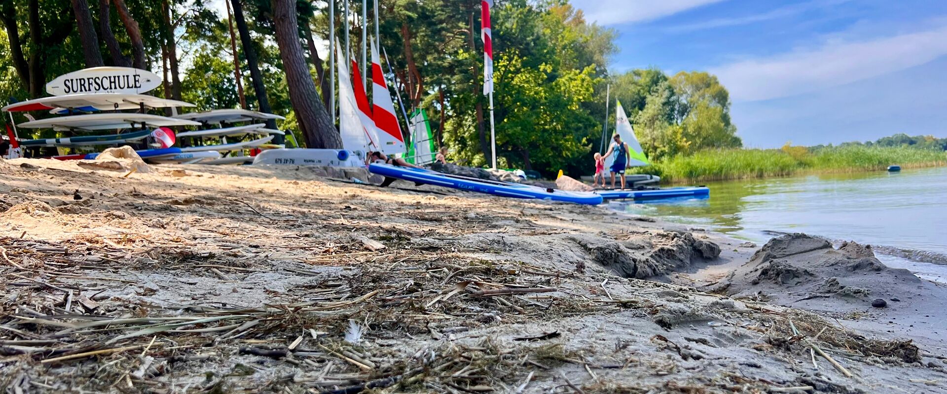 Hier findet ihr Parzellen in Wassernähe, freie und schattige Stellplätze für Zelte, Wohnwagen, Caravans, Radfahrer und die allerschönsten Sonnenuntergänge am Südostufer der Müritz. Wenn’s euch mal packt, habt ihr sogar die Möglichkeit Profisurfer zu werden – Moni wird’s euch zeigen. 😊