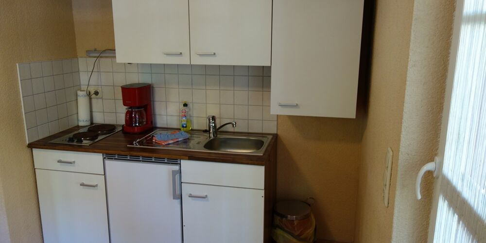 Wasserkocher, Kaffeemaschine, Kühlschrank mit kleinem Frostfach, 2 Herdplatten, 5x Trinkgläser, 5x Tassen, 5x Frühstücksteller, 5x Müslischalen/Suppe, 5x große Teller, Besteck, (Messer, Gabel, Löffel, kl. Löffel), 2 Pfannen (groß/klein), 2x Töpfe, 1x Tiegel, Schüsselset (für Salat, Nudelsieb), Küchenhelfer (Kelle, Pfannenwender, Spaghetti-Nudelkelle, gr. Löffel), Brotkorb, Eierbecher, Brotmesser, gr. Messer, Küchenmesser, Spüli, Geschirr-Handtuch, Lappen