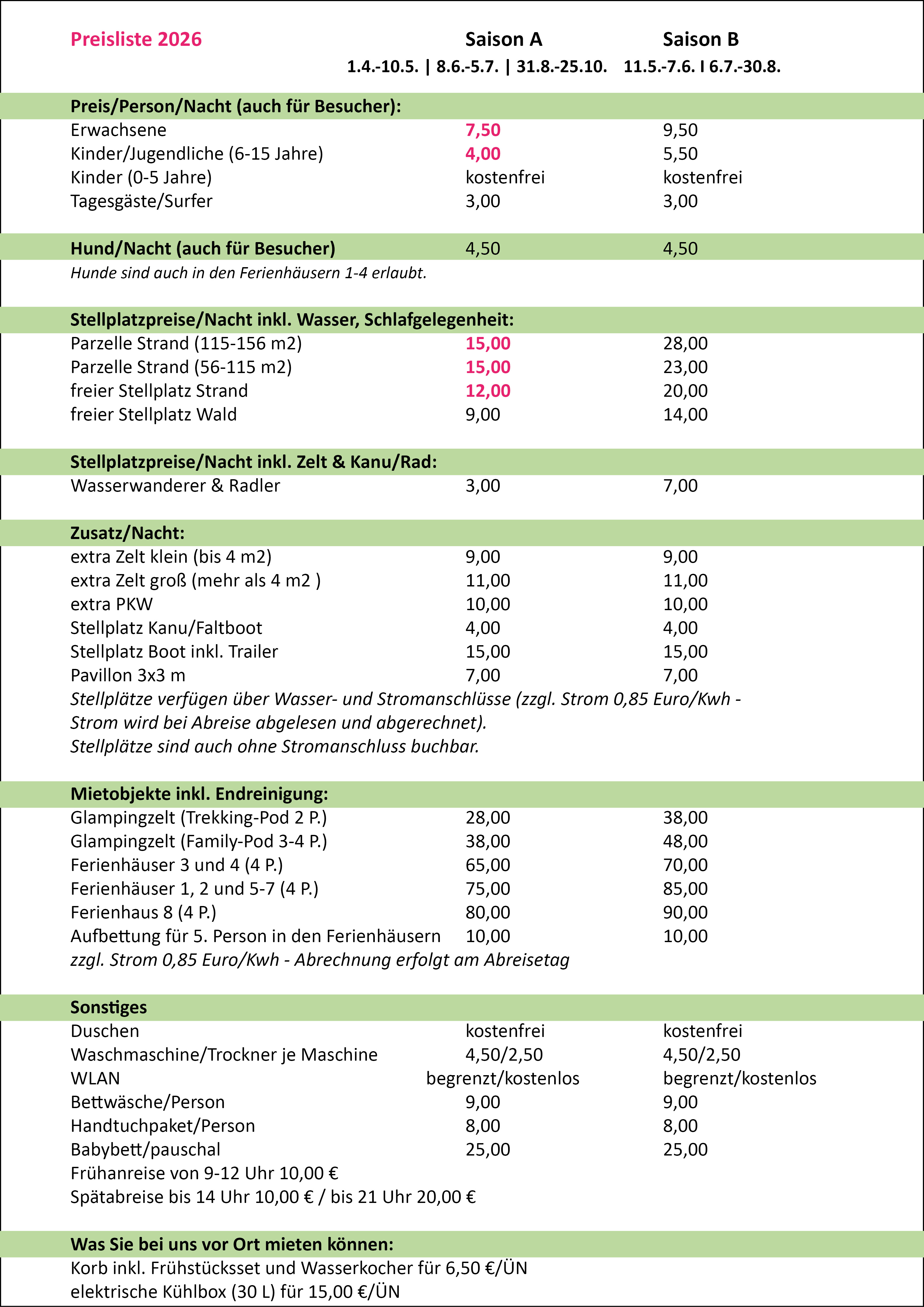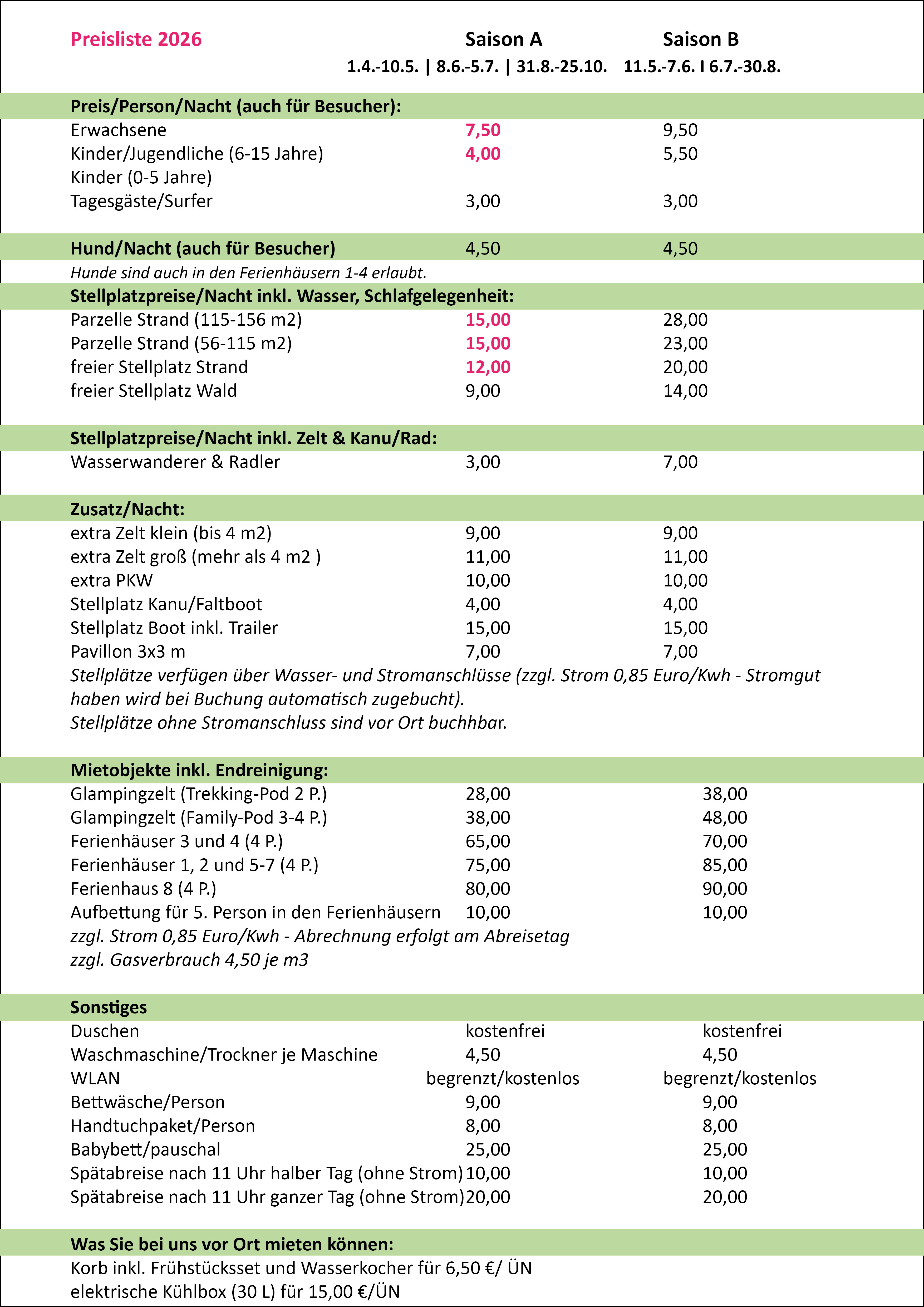 Preise auf dem Campingplatz "Bolter Ufer" C15